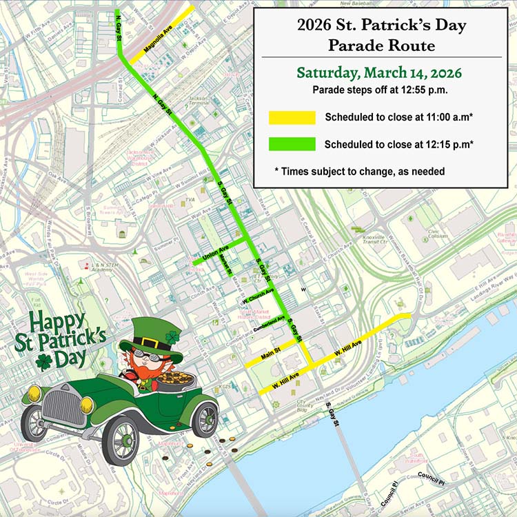 The 2026 Knoxville St. Patrick’s Day Parade will march down Gay Street on Saturday, March 14, stepping off at 12:55 p.m. from the south end of Gay Street and proceeding north to disband at Magnolia Avenue.